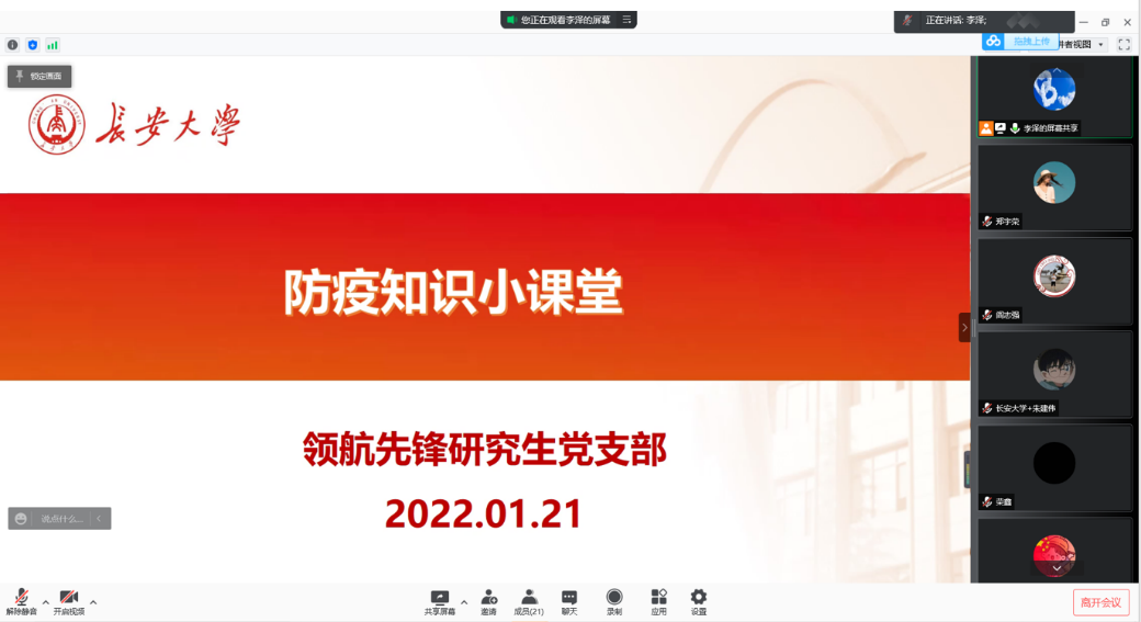 2022年1月21日下午16:00,无限动漫 领航先锋党支部组织支部成员开展线上防疫知识小课堂。支部全体党员参加了此次学习活动,本次活动由支部副书记李泽同志主持。