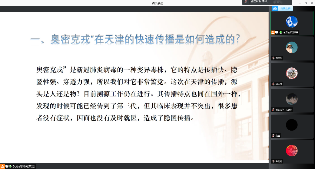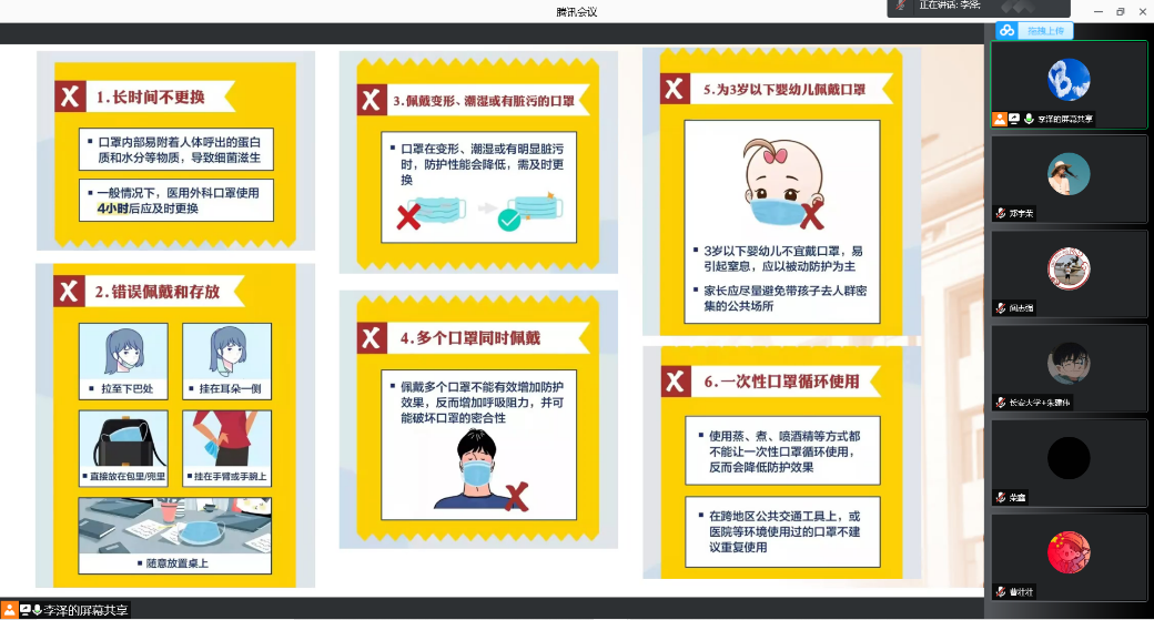 本次线上课堂,李泽同志首先为大家讲解了佩戴口罩的错误事项、佩戴口罩的正确示范以及注意事项。随后,他普及了新冠肺炎病毒的一种变异毒株奥密克戎的特点、造成快速传播的原因等相关知识,呼吁大家提高自我防范意识,积极开展防范措施。