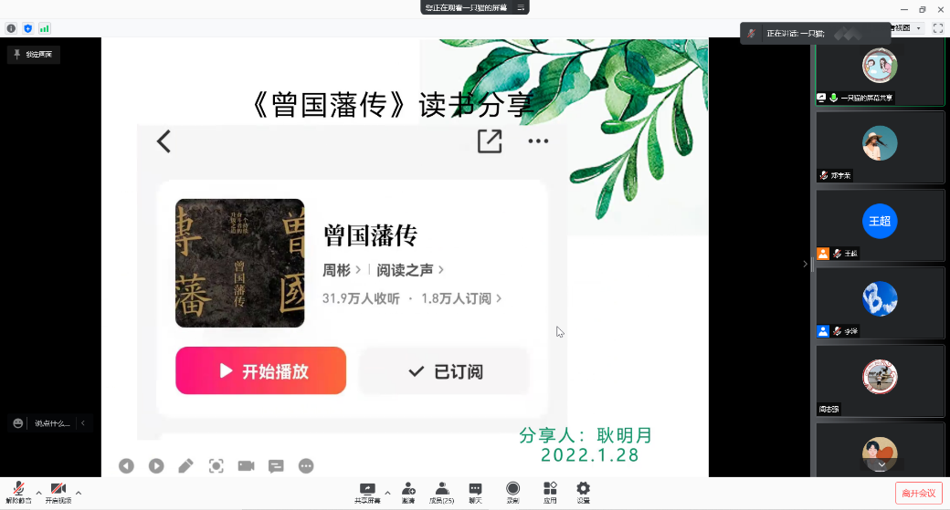 随后,耿明月同志分享了《曾国藩传》,出身于湖南普通家庭的曾国藩年满三十后立志做圣人。随着学识才能和人格品德的不断提升,他的官运一路亨通,得以在复杂的时代变局中超越众人。耿明月同志表示:不评功与过,就其成长经历而言,带给了我很多感触。在学问修养上,曾国藩保持终生学习的习惯,并且强调学习要专注和踏实、时常复盘反思、及时输出学习成果;在品德修养上,他认为立志要高远,要广交良友并向他们学习,做到持之以恒,终生践行。