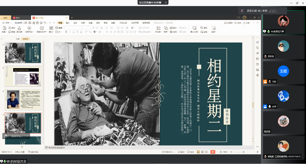 首先,武迪同志分享了美国作家米奇·阿尔博姆所作的《相约星期二》。这本书的内容涉及世界、遗憾、死亡、对衰老的恐惧、家庭、金钱、文化等等,书写了主人公莫里老人对待病痛、衰老、年龄、死亡的心态及有关的论述。武迪同志表示:在读这本书的过程中,我目睹了疾病带给莫里的一切痛苦,但深深震撼我的是莫里的乐观豁达、对事业的挚爱、对社会的贡献、对生命的诠释、对后人的人生指引,他乐观平和的心态和富有哲理性的论述,我感到很受启迪。
