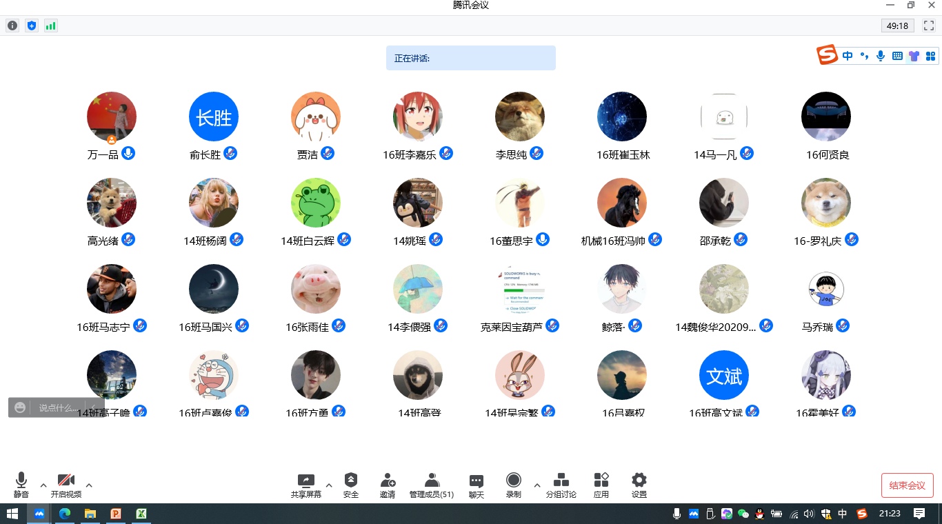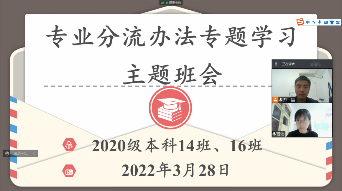 2020级本科生14班和16班通过腾讯会议在线平台联合召开专业分流主题班会。本次班会由14班班主任贾洁老师主持,16班班主任万一品老师主讲,两个班全体同学参加。