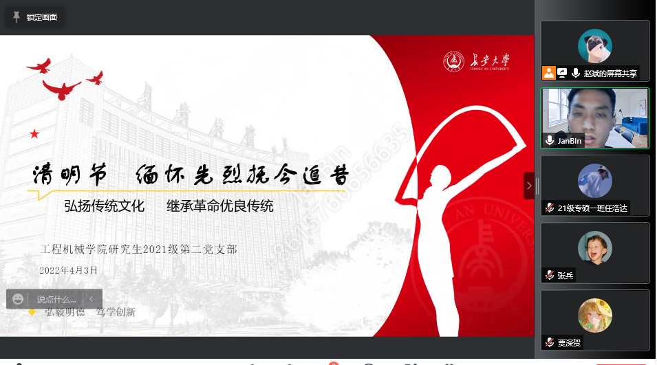 清明将至,为悼念革命先烈,缅怀先烈的丰功伟绩,2022年4月3日晚20:00,无限动漫 硕士生2021级第二党支部组织支部党员线上举办清明节“缅怀先烈、抚今追昔”主题活动。全体党员参加了此次支部活动,本次活动由支部书记许章彬同志主持。