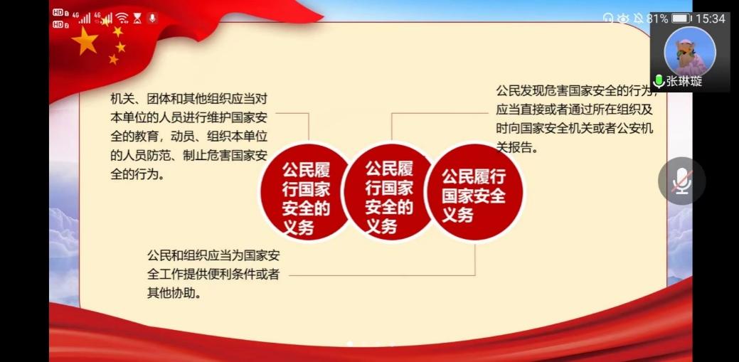 本次党课从何为国家安全、当前国际形势、危害国家安全的行为及相关罪名、如何维护国家安全、谁来保卫国家安全五方面展开,张琳璇号召党员同志们要以4.15全民安全教育日为契机,增加知识,普及常识,坚决维护国家主权、安全、发展利益,遵守宪法、法律关于国家安全的有关规定,及时报告危害国家安全活动的线索,保守所知悉的国家秘密。树立总体国家安全观,增强忧患意识,坚持底线思维,提高自身防泄密、防渗透、防策反的意识和能力,时刻保持清醒的政治头脑,坚决维护国家安全利益。