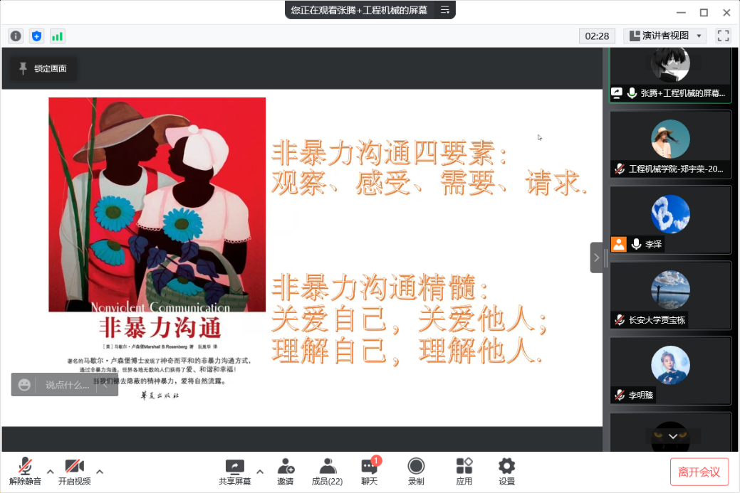 首先,张腾同志分享了马歇尔·卢森堡创作的著作《非暴力沟通》。书中作者介绍了神奇而平和的非暴力沟通方式,通过非暴力沟通,世界各地无数的人们获得了爱、和谐和幸福。人的天性是友善的,暴力的方式是后天习得的,当我们褪去隐蔽的精神暴力,爱将自然流露。张腾同志表示:非暴力沟通的精髓是关爱自己、关爱他人,理解自己、理解他人,这一看起来似乎并不高级的工具,可以帮助我们改善自己的人际关系,如果我们能理解并坚持将它运用到我们的生活中,相信我们的人生境界会豁然开朗。
