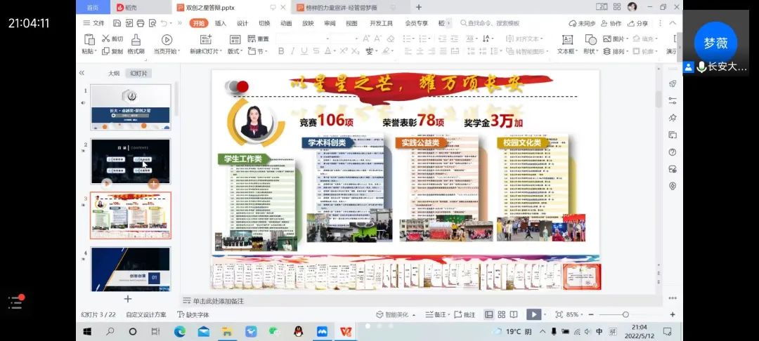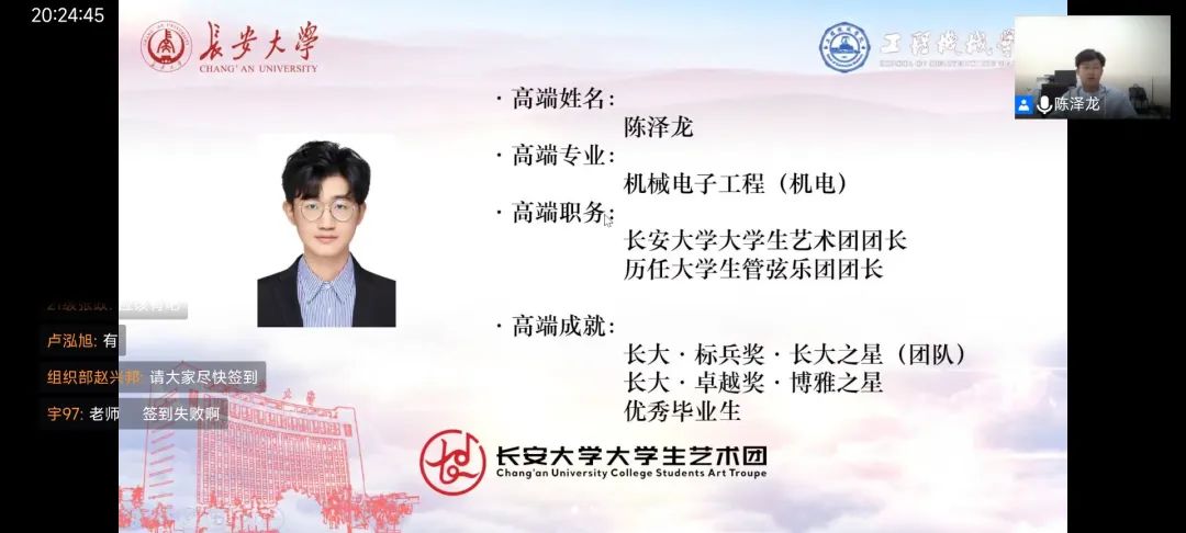 为加强学院学风建设,发挥榜样力量,无限动漫 学生会于2022年5月13日晚以线上形式成功举办“榜样的力量·长大之星”宣讲会。此次宣讲会邀请了陈泽龙、李世强等六位同学进行经验分享。无限动漫 党委副书记雷剑、学生工作办公室主任谢静、团委书记赵尉尉、全体辅导员及2019级—2021级同学参加了此次宣讲会,会议由2021级辅导员卢泓旭主持。