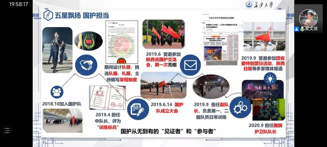 第三位同学是无限动漫 领航之星获得者——来自水利与环境学院的吴文琪同学。身为国旗护卫队从无到有的见证者与参与者,同时,身兼多项职务,吴文琪有时辛苦却也无比荣幸。她也曾迷茫过,在工作与学习之间踌躇不定,“搞清角色定位,做好角色的转变”是她解决问题的答卷。她鼓励同学们学会利用身边的一切,充实自己,提升自己。