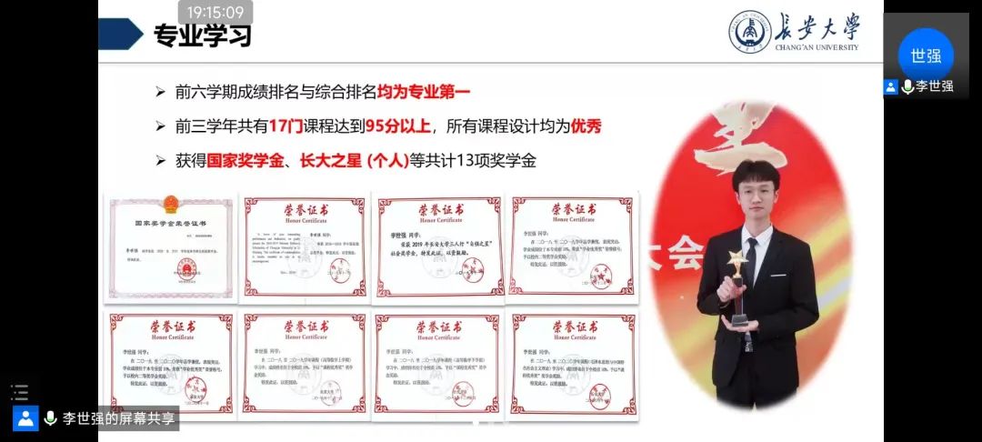 第二位同学是长大之星个人奖项获得者——来自经济管理学院的李世强同学。在短暂的自我介绍后,李世强同学从“专业学习”、“科研竞赛”、“保研准备”三个方面分享,分享了本人的经验。分享最后,他鼓励大家要勇于创新,敢于超越,充分利用“巨人的肩膀”,要坚信办法总比困难多。