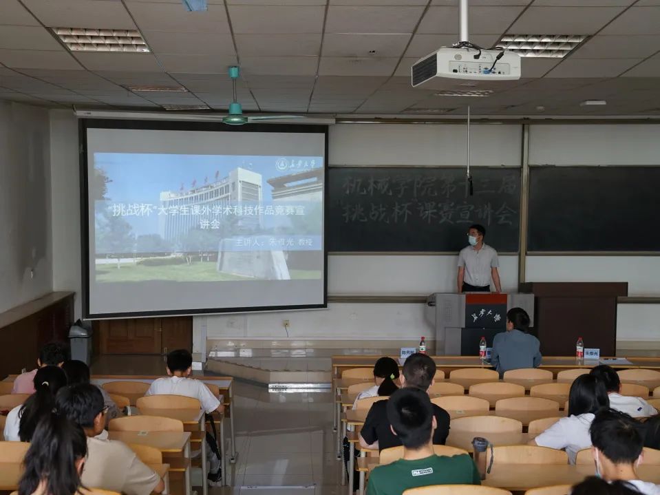 接着,朱雅光教授向同学们介绍本届“挑战杯”比赛。朱雅光教授从挑战杯赛事简介、参赛要求、参赛建议、作品撰写、参赛中应该注意的问题及往届国赛获奖作品六个方面为大家进行讲解。朱雅光教授提出竞赛的宗旨:崇尚科学,追求真知,勤奋学习,锐意创新,迎接挑战。竞赛的目的为培养学生创新精神和实践能力。同时,朱教授为大家讲解了具体参赛要求:以创新为灵魂,以助力经济发展为目标,以科学性为原则,以竞赛规则为红线,朱雅光教授强调,提出一个好题目能够在比赛中更加亮眼。