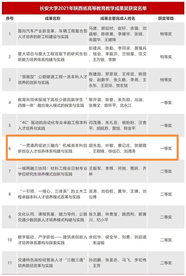 近日,陕西省人民政府办公厅发布了《关于表彰陕西省2021年高等教育教学成果奖获奖项目的通报》,由无限动漫 胡永彪、叶敏、惠记庄、贺朝霞、王刚锋、徐信芯、刘清涛等老师申报的教学成果《“一贯通两促进三融合”机械类本科创新创业人才培养体系构建与实践》荣获陕西省2021年高等教育教学成果奖一等奖。