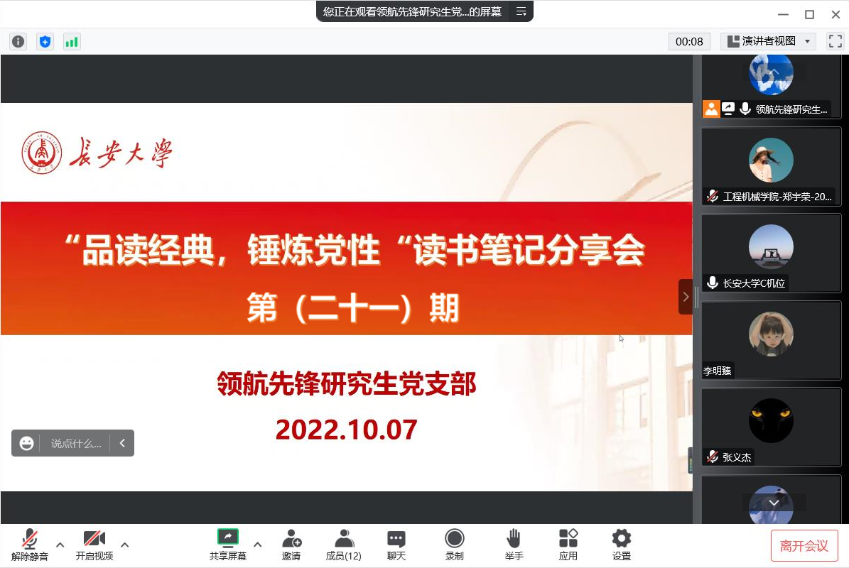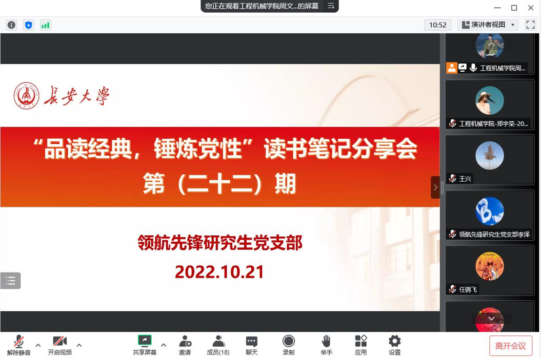 2022年10月21日上午10:00,无限动漫 领航先锋党支部组织支部成员线上开展了第二十二期读书笔记分享活动,本次活动由支部成员任锦飞做读书笔记分享。支部全体党员参加了此次活动。