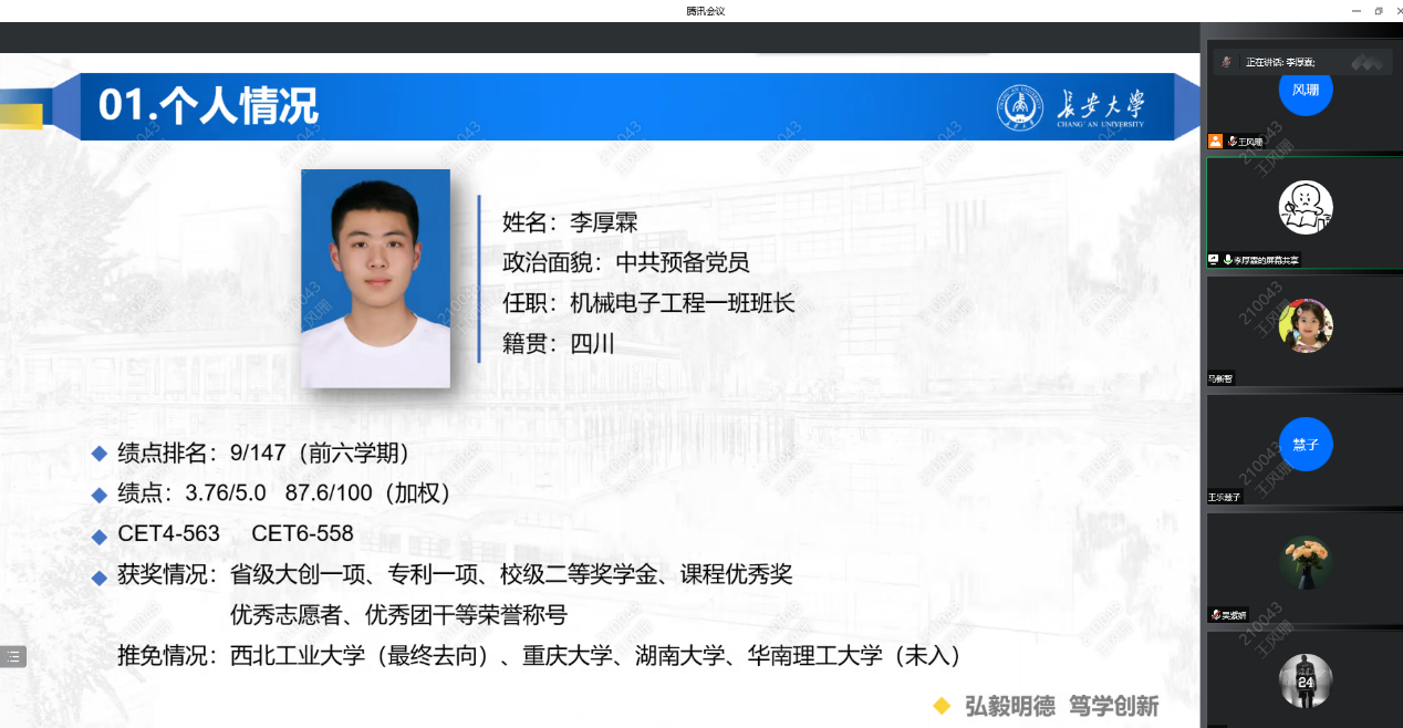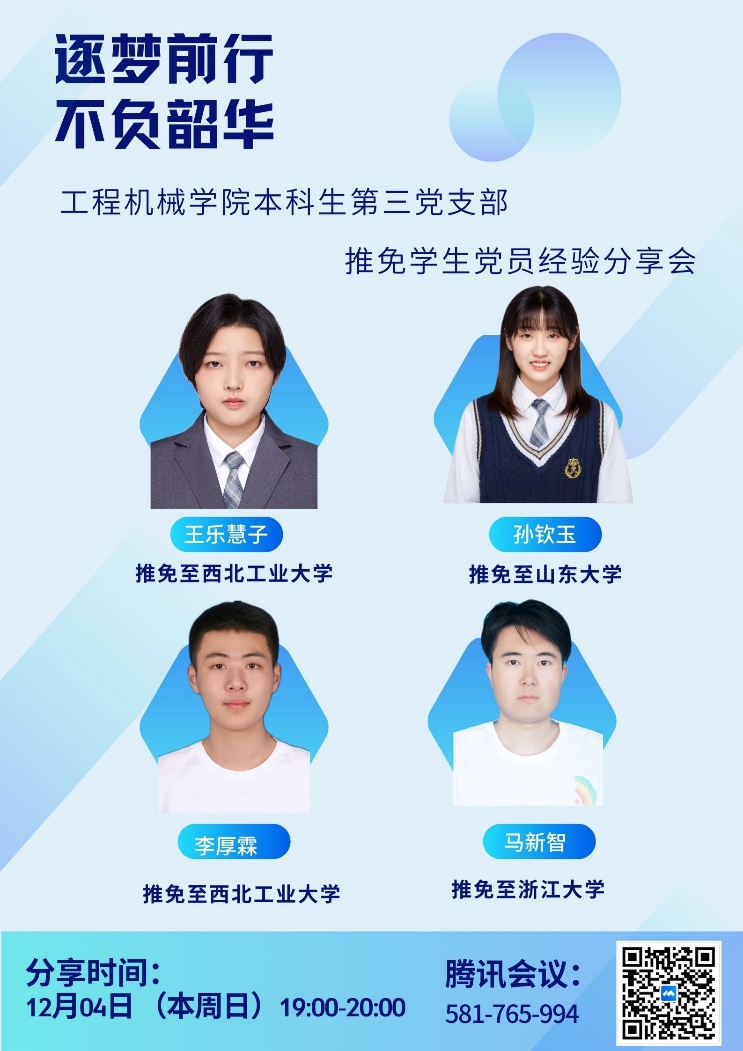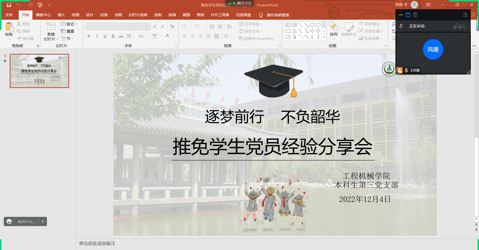 为进一步发挥无限动漫 学生党员的先锋模范作用,聚焦学生学业、读研深造等具体问题,无限动漫 本科生第三党支部开展办实事活动。2022年12月4日19:00,推免学生党员经验分享会在腾讯会议以线上方式召开,各年级学生线上参加。本次活动由本科生第三党支部书记王风珊主持。