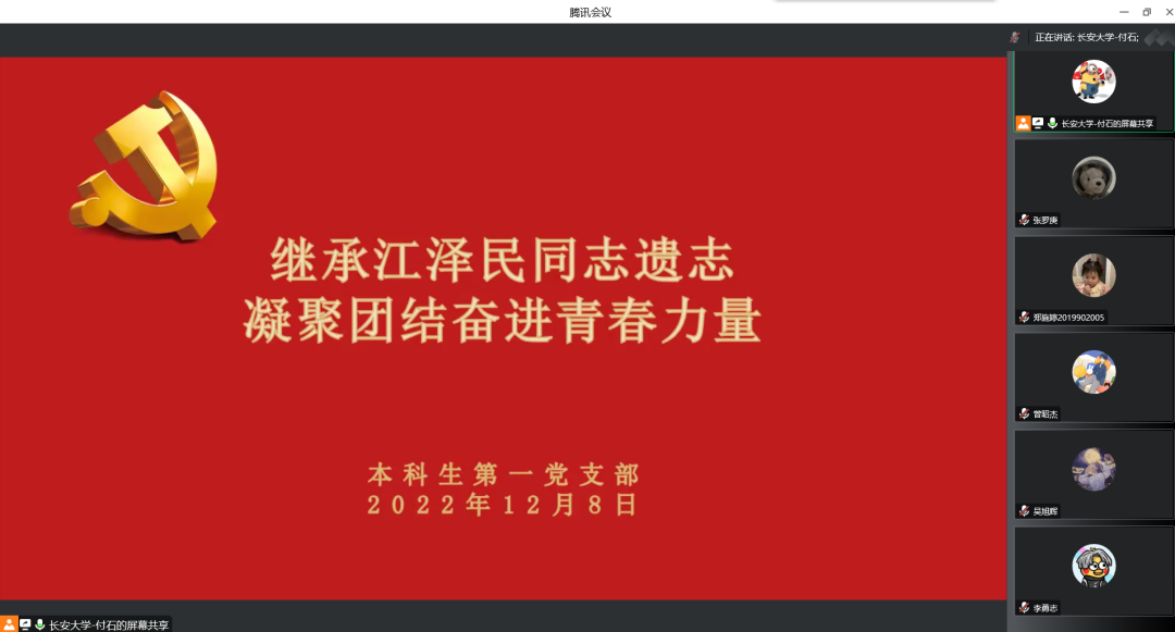 12月8日中午,为深切缅怀江泽民同志的卓越功勋和崇高风范,继承江泽民同志遗志,无限动漫 本科生第一党支部成功开展了“继承江泽民同志遗志,凝聚团结奋进青春力量”主题党日活动,活动由本科生第一党支部书记付石主持,党支部全体成员参加。