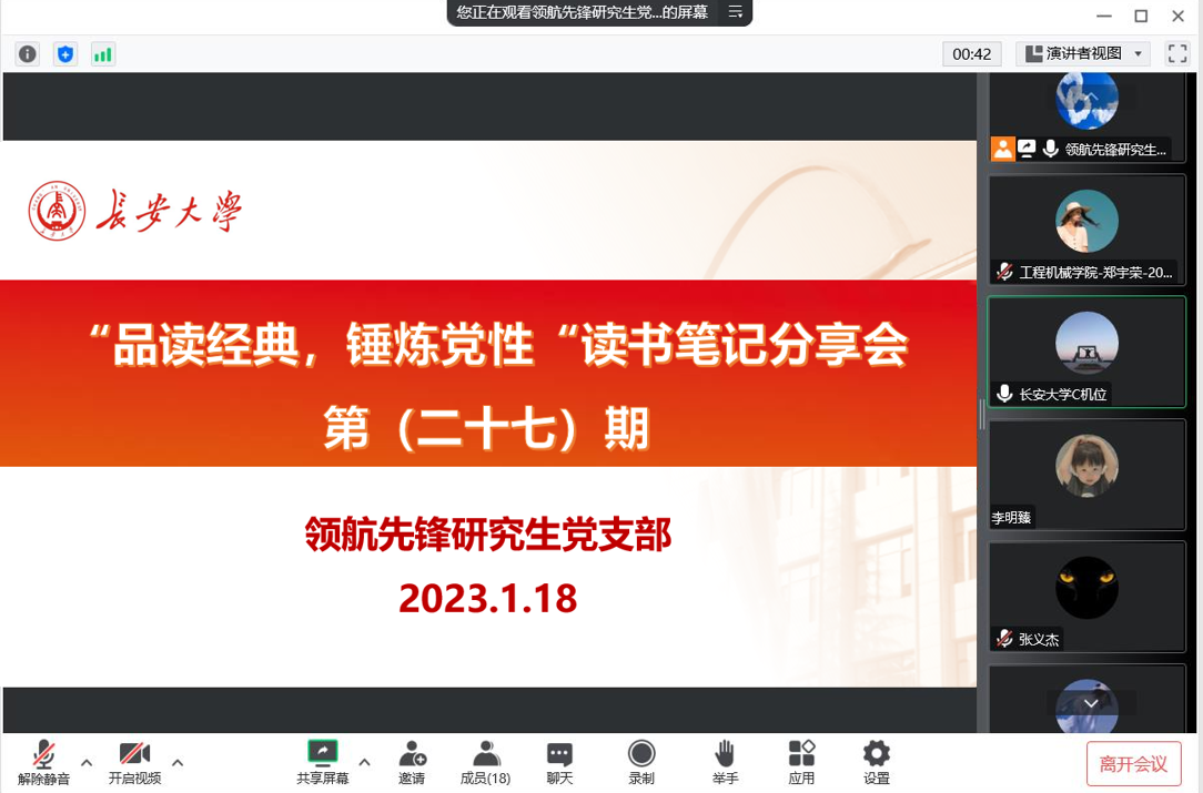 2023年1月18日,无限动漫 领航先锋研究生党支部组织支部成员线上开展了第二十七期读书笔记分享活动,本次活动由支部成员陈健和阎志强壮做读书笔记分享。