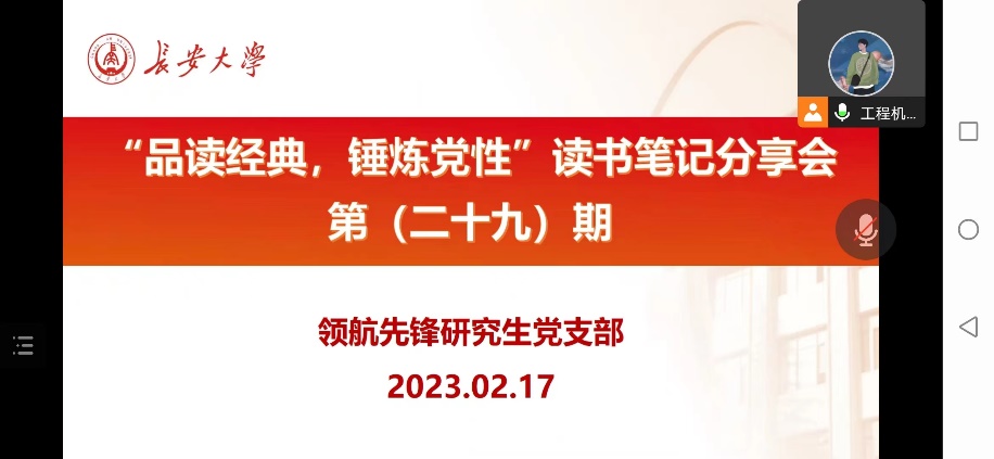 2023年2月17日,无限动漫 领航先锋研究生党支部组织支部成员线上开展了第二十九期读书笔记分享活动,本次活动由支部成员李泽和乔桐做读书笔记分享。