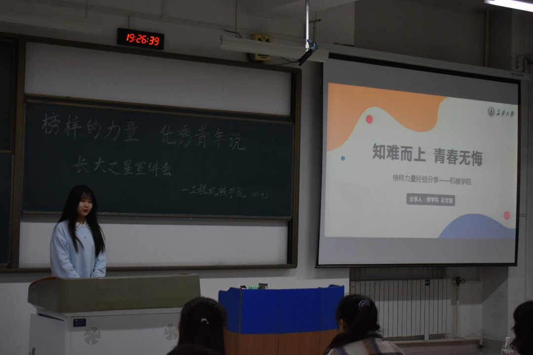 第二位分享的同学是长大之星、求真之星获得者——来自2019级理学院的吴文娜。吴文娜首先在学习方法上给同学们提出了一些小建议,其次就平衡工作与学习上分享了自己的一些方法和经验,接着介绍了自己的工作和科创竞赛经历,也讲述了自己由此获得的成长和提高,在宣讲的最后吴文娜希望同学在大学四年里提早树立目标,多尝试新东西扩大自己的朋友圈,健康且充实地度过大学生活。
