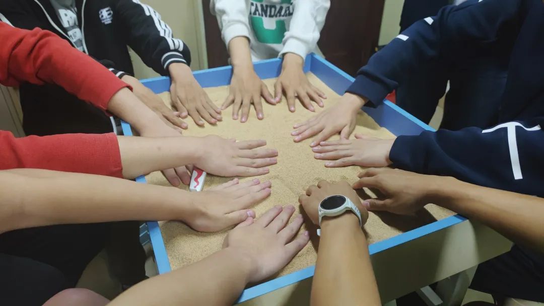 一开始团队成员大都按照自己的想法各持己见,沙具摆设也相对无序;之后有团队成员开始注意和思考其他人的想法,并配合他人摆放的基调进行放置,沙盘逐渐有条理,成员之间的配合也更多;到最后,团队向着同一个主题进行摆设。经过团队成员的合作,最终构建出了一副沙盘作品。