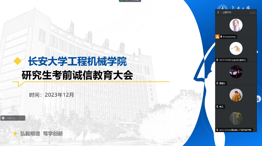 临近期末,为端正考风考纪,进一步加强学院学风建设,培养学生的学术诚信、营造浓厚的学术氛围,2023年12月20日,无限动漫 线上开展了学术诚信教育讲座。研究生辅导员高婷婷、寇文娟、张琳璇,2023级全体研究生参加。学院希望通过此次讲座让学生更加深入地了解学术诚信的重要性,增强他们的学术自律意识,倡导严谨规范的学术行为,营造良好的学术环境,避免作弊和抄袭等不良行为。