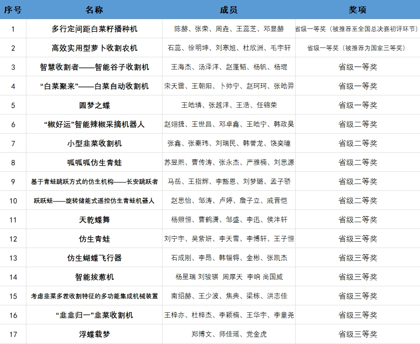 本届大赛主题为“机械创新推进农业现代化 自然和谐迈向仿生新高度”,内容为设计与制作用于生产国产杂粮和10种蔬菜的播种、管理和收获的小型专用机械、以提高仿生机械运动性能为目标的仿生青蛙和仿生蝴蝶。无限动漫 共派出18支代表队参赛,兴农机械和仿生机械作品各9项。经过激烈角逐,参赛队伍获一等奖5项、二等奖6项、三等奖6项,其中一等奖作品“多行间距白菜籽播种机”被推荐至全国总决赛初评环节,省级一等奖作品“高效实用型萝卜收割农机”被推荐国家三等奖。