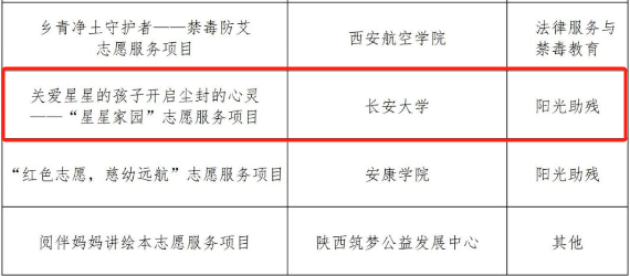 2024年6月3日,由共青团陕西省委、省委社会工作部、省交通运输厅、省水利厅、省文化和旅游厅、省卫生健康委等单位共同指导,陕西省青年志愿者协会主办的陕西省第一届青年志愿服务项目大赛获奖项目名单公布,由无限动漫 吴德林、卢泓旭老师指导,无限动漫 青年志愿者服务队开展的关爱星星的孩子 开启尘封的心灵——“星星家园”志愿服务项目获得优秀奖。