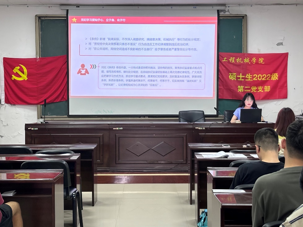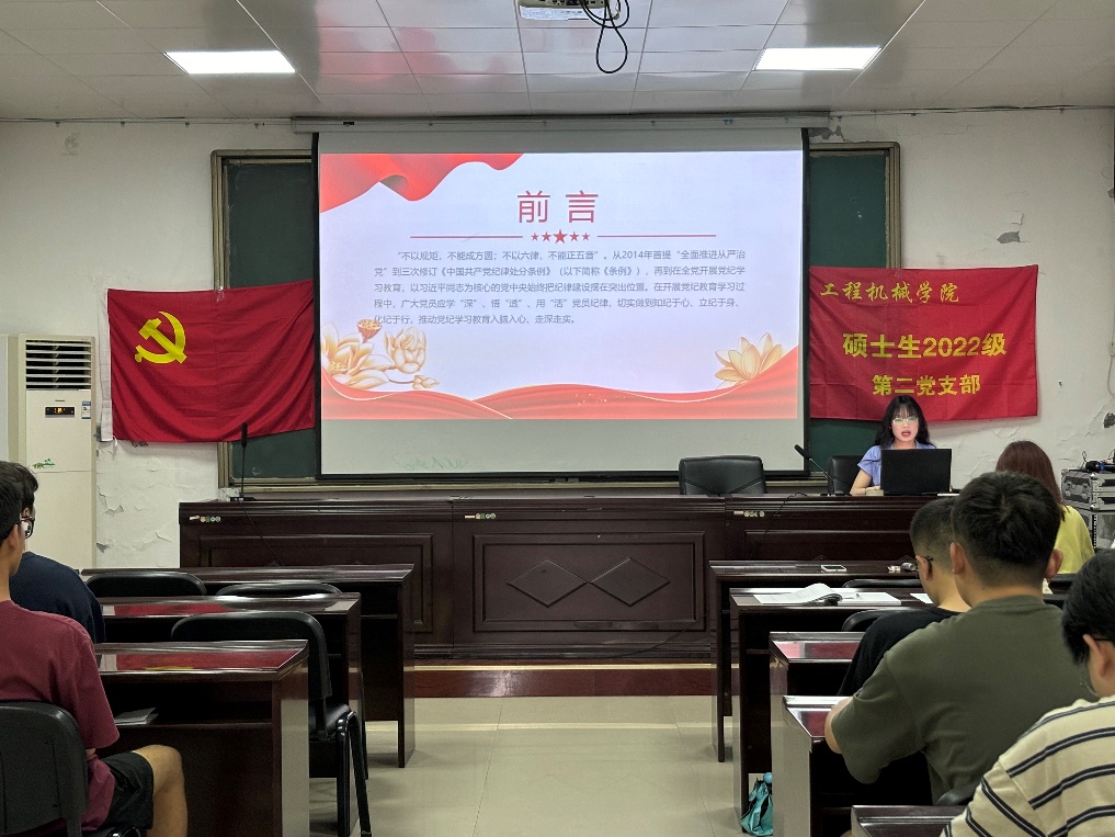 “不以规矩,不能成方圆;不以六律,不能正五音”。为落实中共中央办公厅印发的《关于在全党开展党纪学习教育的通知》要求,提升研究生党员的纪律意识, 2024年6月6日下午16时,无限动漫 硕士生2022级第二党支部在南校区学院四楼报告厅开展“学条例·守党纪”党纪学习教育。会议由支部书记赵倩主持,支部全体成员参加。