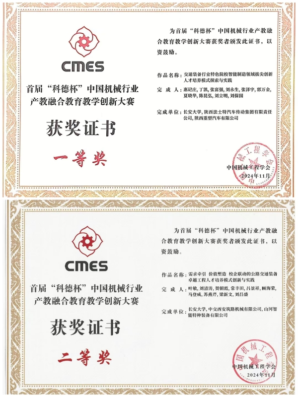 首届“科德杯”中国机械行业产教融合教育教学创新大赛由中国机械工程学会、中国机械行业卓越工程师教育联盟、中国科技发展基金会主办,分为区域赛及国赛两个阶段,设本科组、研究生组及企业组三个组别。自6月份启动以来,共有140所高校、400余家企业的322项作品进入区域赛评审,最终130项作品入围全国总决赛。在全国总决赛阶段,经过连续两轮严格的现场答辩与质询,惠记庄教授牵头的“交通装备行业特色院校智能制造领域拔尖创新人才培养模式探索与实践”项目获研究生组一等奖,叶敏教授牵头的“需求牵引 价值塑造 校企联动的公路交通装备卓越工程人才培养模式创新与实践”项目获本科生组二等奖。此外,在区域赛阶段,张富强副教授和苏燕芹副教授牵头的两个项目均获西北赛区二等奖。