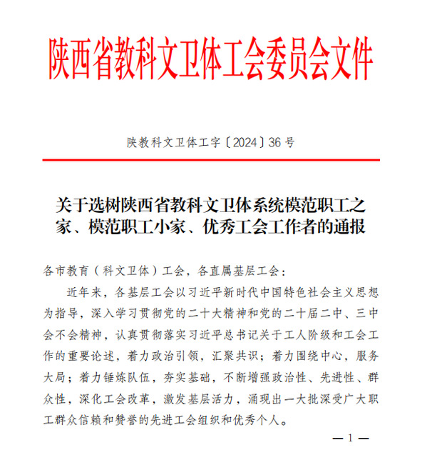 近日,根据《关于选树陕西省教科文卫体系统模范职工之家、模范职工小家、优秀工会工作者的通报》(陕教科文卫体工字〔2024〕36 号)文件,无限动漫 分工会荣获陕西省教科文卫体系统“模范职工小家”荣誉称号。