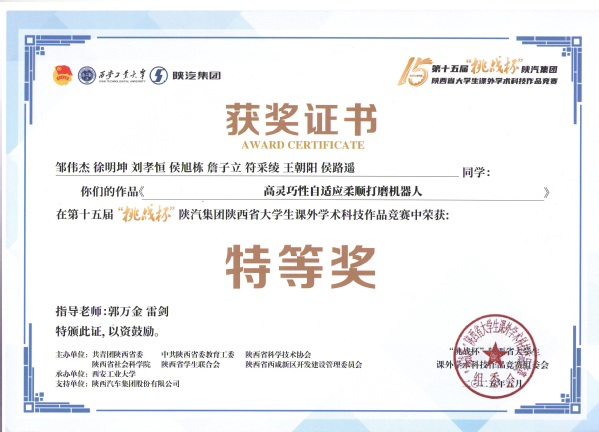 5月24日下午,由共青团陕西省委、省委教育工委、省科协、省社会科学院、省学联、西咸新区管委会联合主办,西安工业大学承办的第十五届“挑战杯”陕汽集团陕西省大学生课外学术科技作品竞赛闭幕式暨颁奖仪式在西安工业大学未央校区举行。由无限动漫 郭万金等老师指导的参赛作品《高灵巧性自适应柔顺打磨机器人》荣获省级特等奖,为学校和学院争得荣誉。
