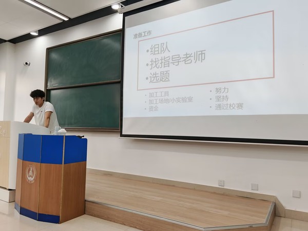 陈赫向同学们详细介绍了机械创新大赛的历史背景、比赛规则、评审标准以及奖项设置。他用生动形象的案例展示了往届优秀作品的创新点和闪光点,让在场同学对大赛有了更直观的认识。在讲解过程中,陈赫还着重强调了机械创新大赛在行业发展中的重要性,鼓励同学们积极参与,勇于挑战自我,将所学知识转化为实际成果。同时,他还分享了在团队协作方面的宝贵经验,强调了成员间明确分工、高效沟通的重要性,鼓励同学们在备赛过程中发挥各自优势,形成强大的团队合力。