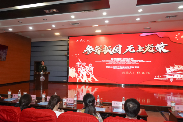 退役大学生张佳琛以《参军报国 无上光荣》为题进行国防教育演讲,他回顾了自己参军入伍的经历,并号召在场毕业生,无论未来从事何种职业,都要心怀家国,增强国防意识,在国家需要之时,勇敢站出来,以不同的方式为国防事业贡献力量,因为每一份坚守,每一次拼搏,都是对“参军报国 无上光荣”最好的诠释,都是对祖国最深情的告白。