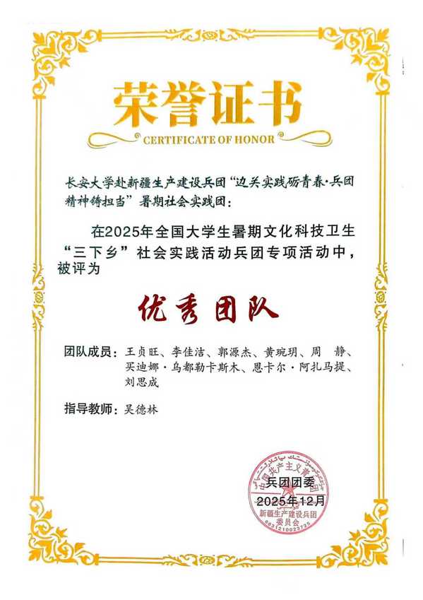 近日,在共青团新疆生产建设兵团委员会开展的2025年全国大学生暑期文化科技卫生“三下乡”社会实践“卫国戍边兵团行”兵团专项活动中,由无限动漫 师生组成的无限动漫 赴新疆生产建设兵团“边关实践砺青春·兵团精神筑担当”暑期社会实践团被评为“优秀团队”。